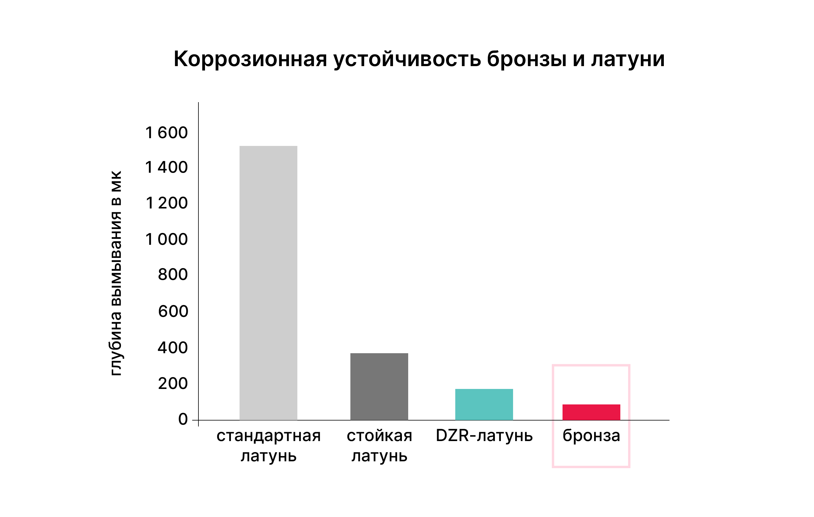 90% аварий в инженерных системах происходит из-за разных видов коррозии: коррозионное растрескивание из-за вымывания цинка, коррозия под напряжением и электрохимическая (контактная) коррозия. Это увеличивает риск протечек. Приходится тратить время и деньги на незапланированный ремонт. Фитинги из красной бронзы устойчивы к перечисленным видам коррозии, в том числе в 2,5 раза более устойчивы к коррозии, чем DZR латунь и в 15 раз, чем стандартная латунь.